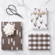 Rustic Christmas wrapping sheets with three matching patterns in white, brown, and black with a snowfall in the forest, deer heads, and plaid.