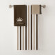 Handsome bath towel set done in brown, tan and white featuring stripes, on the bath towel and the wash cloth is tan with a brown stripe. The brown hand towel has graphics of a white and tan crown, with tan text reading His. Personalize the text to read what you want. Great gift idea for weddings and new home owners. Available in a matching hers set.