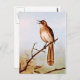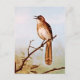 A cute little brown thrasher sings in this illustration by Ernest Seton Thompson. This speckled brown and white bird perches on a branch against a pale grey blue sky with his beak wide open.