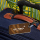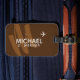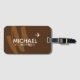 A cool and modern luggage tag personalized with the name and initial of the traveller on a brown background