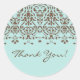 Our elegant brown damask on a turquoise blue background thank you stickers are the Perfect finishing touch for you thank you notes or bridal shower favours. Matching items available in our shop @ www.celebrateitinvites.com. This item is available in a variety of colour combinations!