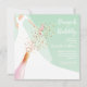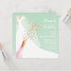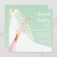 Brunch and bubbly bridal shower invitations feature a bride in her gown and veil on a mint green background with a pink bottle of sparkling wine, glass flute and faux sequins with your details in chic white lettering. **TIP: Square size REQUIRES EXTRA POSTAGE. MATCHING items in our collection.