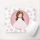 This design features a cute brown haired Princess with pink gown, crown and gloves on a super cute pink dot background.
