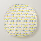 Decorative round pillow with yellow and grey pattern.
