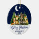 Modern Brush Script Merry Christmas Watercolor Woodland Animals Forest Animals Pine Trees Moon, Starry Sky and Snow Ornament . Baby Animals include Bear, Deer, Moose, Raccoon, Bunny Rabbit, Fox and Owl with forest greenery. Blue Text. Add Name.