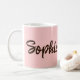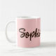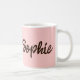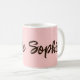 This personalized name mug is the perfect gift for your wife, daughter, colleague, friend, or anyone you want to treat for birthdays, Christmas, weddings, and other occasions. It features a cool, casual brush script in dark brown over a light pink background. The editable text is on both sides of the mug, and the font and colour can be changed as you wish. For longer names, decrease the font size to fit.