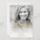 These trendy graduation celebration invitations feature sparkling foil confetti in shades of gold, eye-catching script text and grungy, painted brush strokes in black on white. Script is optional and can be deleted to use the card for other occasions. Use the provided template add your photo and customize your event details or edit to suit your event. The gradient overlay and confetti layers can be moved or resized to suit your own photo. An optional black and white filter will be automatically applied to your photo but it can be changed to suit your preferences. Search ID511 to see other color options for this design.