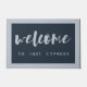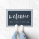 A great gift for newlyweds or new homeowners, our personalized welcome doormat in chic navy blue and grey features "welcome" in modern, brush script lettering. Personalize beneath with your house number, address, house name or family name.