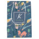 Blue-grey background and yellow, green and coral flowers.