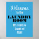 Bienvenue dans la salle de blanchisserie. C'est plein de plaisir ! J'ai fait ça pour notre buanderie et j'ai tellement aimé que j'ai décidé de le partager ici. Vous êtes en train de regarder une affiche de 18 po x 24 po prête à être cadrée et suspendue. L'arrière - plan est bleu vif. La typographie audacieuse est une combinaison de noir et blanc. Le sentiment est "Bienvenue dans la salle de blanchisserie. C'est plein de plaisir !"