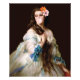 Pop art remix of a vintage painting of a woman with two flowers in her hair blowing a pink bubble gum