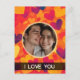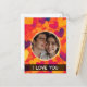 This customizable design has mainly warm coloured hearts scattered around a circular mask in which you can place your own photo. You can also customize the message.