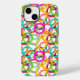 This phone case has a geometric design of three circles nested together and spread throughout the design in several colours.