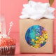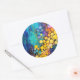 A painting features vividly coloured bubbles against a deep blue background in a geometric abstract style. The colours are rich and vibrant, creating an eye-catching and dynamic visual.