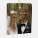 A deer couple in wedding attire, with the doe bride in a floral headpiece and veil and the buck groom in a suit and bow tie, stands in a forest.