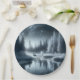 A serene winter night is depicted with a deer standing by a reflective river surrounded by snow-covered trees