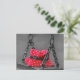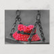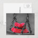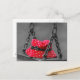 Postcard featuring a picture of a girl's red and white polka dot bucket hat sitting on a swing on a dreary grey day.
