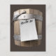 A vintage wooden bucket with metal ring supports and a handle and a blank paper attached to the front with the words bucket list