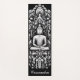 Make a statement with this meticulously detailed black and white design of Buddha. This mat features a captivating image of Buddha meditating in the lotus position, adorned with decorative abstract shapes. There is also space for your name or ideas, such as 'Namaste,' 'Om' etc., or even your studio name.