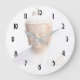A clock with a tranquil and peaceful image of a statue of the Buddha all in white. Symbol of purity and enlightenment.