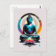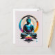 A Buddha statue is sitting amidst a colourful Zen circle, with a lotus flower.