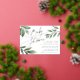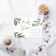 Simple and elegant baby shower invitation for modern moms-to-be features "baby shower" at the top left in chic rose gold foil script typography with soft green watercolor leaves and branches. Personalize with your baby shower details in grey lettering. A modern gender neutral baby shower invitation in a nature inspired colour palette.