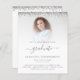 A value for money BUDGET alternative on a smaller size 4.5 x 5.6” semi-gloss 110lbs weight, which is of similar thickness to a postcard (however is not suitable to use as a postcard.). PLEASE NOTE there is ONE per sheet. Budget 2024 Graduation Photo Silver Glitter Party Invitation. Glam silver faux glitter borders are at the top on the both sides. Graduate is in an elegant script with swashes. Easily personalise the text to your own requirements, and replace the sample image with your own. To keep the minimalist contemporary look of this design, a photo with a light colored background will work well.