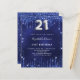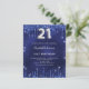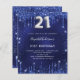 A modern, stylish and glamourous invitation for a 21st birthday party. A navy blue background, decorated with faux glitter dust. The blue colour is uneven. Personalize and add your name and party details. Number 21 is written with a balloon style font, script, silver coloured.