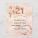 A rose gold, blush pink rustic faux metallic looking background. Decorated with rose gold and pink florals, roses, pampas grass. Personalize and add a name and party details. Number 21 is written with a balloon style font.