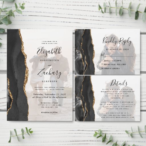 Budget 2-Photo Black Gold Agate Wedding Invitation