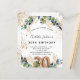 For a 30th birthday party. A white background decorated with eucalyptus greenery and golden leaves. Golden faux glitter spots. Personalize and add your names and wedding details. Black and golden coloured letters. Number 30 is written with balloon style font.