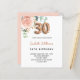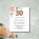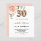An elegant invitation for a 30th birthday party. A chic white background. Decorated with a rose gold and blush pink watercolored rose flower, floral, green eucalyptus leaves, sprigs, greenery and faux gold sprigs. Personalize and the name and party details. Black and golden letters. The name is written with a modern hand lettered style script. Number 30 is written with a golden balloon style font.
