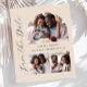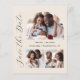 This simple, minimalist Save the Date card features a photo collage arch, with a horizontal photo at the top and two square photos at the bottom. The words "Save the Date" run vertically up the left margin in elegant black handwriting script. The couple's names, wedding date and city appear in between the photos in black sans serif font on a beige background. Add a more detailed message with additional information on the back.