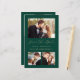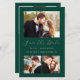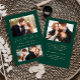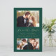 This simple, minimalist Save the Date card features a photo collage, with a horizontal photo at the top and two square photos below. Between the top and bottom photos, the words "Save the Date" appear in elegant gold-coloured handwriting script, followed by the couple's names, wedding date and city in sans serif font on an emerald green background. Add a fourth, horizontal photo and a more detailed message with additional information on the back.