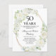 Elegant 50th wedding anniversary invitation template features a gold frame and two arrangements of white roses. All of text is editable.