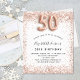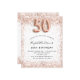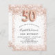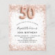 For an elegant 50th birthday. A white background. Decorated with rose gold, pink faux glitter, sparkles. Personalize and add a name, and party details. The name is written with a hand lettered style script, number 50 with balloon style fonts.