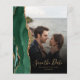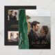 The left-hand edge of this elegant modern wedding save the date card features an emerald green watercolor agate border trimmed with faux gold glitter. The customizable text overlay combines gold-coloured handwriting script and copperplate fonts over a photo of your choice. A black gradient filter helps make the text pop. The back provides spaces for four additional photos (one square, two horizontal and one vertical), along with room for your wedding website URL or other brief message in gold-coloured text on an off-black background.