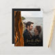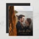 The left-hand edge of this elegant modern wedding save the date card features a burnt orange and rust watercolor agate border trimmed with faux gold glitter. The customizable text overlay combines gold-coloured handwriting script and copperplate fonts over a photo of your choice. A black gradient filter helps make the text pop. The back provides spaces for four additional photos (one square, two horizontal and one vertical), along with room for your wedding website URL or other brief message in gold-coloured text on an off-black background.