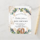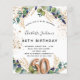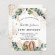 For a 60th birthday party. A white background decorated with eucalyptus greenery and golden leaves. Golden faux glitter spots. Personalize and add your names and wedding details. Black and golden coloured letters. Number 60 is written with balloon style font.