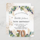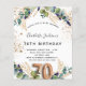 For a 70th birthday party. A white background decorated with eucalyptus greenery and golden leaves. Golden faux glitter spots. Personalize and add your names and wedding details. Black and golden coloured letters. Number 70 is written with balloon style font.