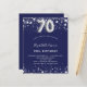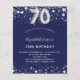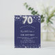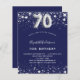 A modern, stylish and glamourous invitation for a 70th birthday party. A navy blue background, decorated with faux silver stars. Personalize and add your name and party details. Number 70 is written with a balloon style font.