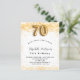 For an elegant 70th birthday party. A chic white background. Decorated with faux gold glitter, sparkles. Personalize and add a name, age and party details. The name is written with a hand lettered style script. Number 70 with balloon style font.