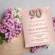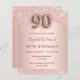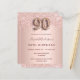 A modern, stylish and glamourous invitation for a 90th birthday party. A faux rose gold metallic looking background with an elegant faux rose gold glitter drip, paint drip look. The name is written with a modern dark rose gold coloured hand lettered style script. Personalize and add your party details. Number 90 is written with a balloon style font, script.