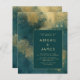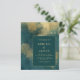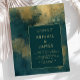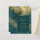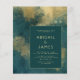 This elegant, moody wedding invitation features a modern abstract teal and gold watercolor background. Customize the gold-coloured text in stylish fonts on a dark teal rectangle. The abstract design is repeated on the back of the card.