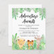 It features a hand-drawn watercolor of lion, giraffe, and tiger cubs with green palm leaves and says "Adventure Awaits!" in rustic typography.