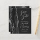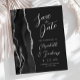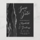 The left-hand edge of this elegant modern wedding save the date card features a black watercolor agate border trimmed with faux silver glitter. The customizable text combines silver grey handwriting, copperplate and italic fonts on a dark background. The reverse side features a matching black and silver agate design.