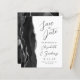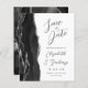 The left-hand edge of this elegant modern wedding save the date card features a black watercolor agate border trimmed with faux silver glitter. The customizable text combines charcoal grey handwriting, copperplate and italic fonts on a white background. The reverse side features a matching black and silver agate design.