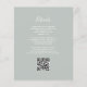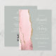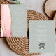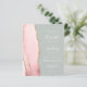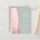 The left-hand edge of this elegant modern wedding invitation features a blush pink watercolor agate border trimmed with faux gold glitter. The customizable text combines white handwriting, copperplate and italic fonts on a pale sage green background. The reverse side provides space for wedding details on a solid sage green background, along with a QR code guests can scan to visit your website and RSVP, which saves the cost of printing and mailing separate RSVP