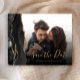 This elegant horizontal save the date card features a black watercolor agate border trimmed with faux gold glitter. Easily replace the sample image with your own photo of the future bride and groom. The customizable text combines gold-coloured handwriting script and copperplate font; a black gradient filter helps make the text pop. The back features a matching black and gold agate design.