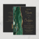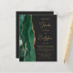 The left-hand edge of this elegant modern wedding invitation features an emerald green watercolor agate border trimmed with faux gold glitter. The customizable text combines trendy gold-coloured script and sans serif fonts on a dark background. The reverse side provides space for wedding details on a solid dark background, along with a QR code guests can scan to visit your website and RSVP, which saves the cost of printing and mailing separate RSVP cards.